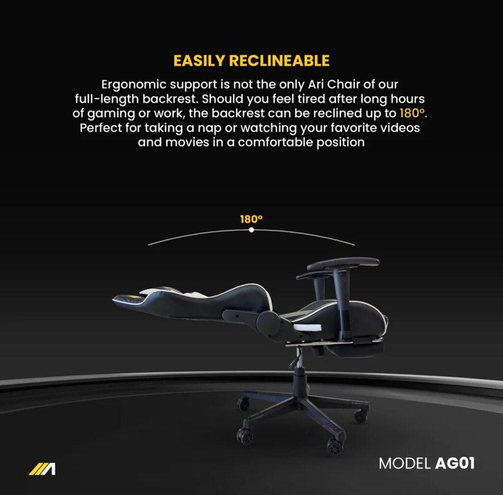 Ergonomic support is not the only Ari Chair of our full-length backrest. Should you feel tired after long hours of gaming or work, the backrest can be reclined up to 180° Perfect for taking a nap or watching your favorite videos and movies in a comfortable position HEAD PILLOW AND LUMBAR PILLOW HEAD PILLOW AND LUMBAR PILLOW The Ari Chair Ag01 features two leather pillows for head and lumbar support. It is designed to be countoured and shaped to perfectly support the arch of your head and spine while sitting
