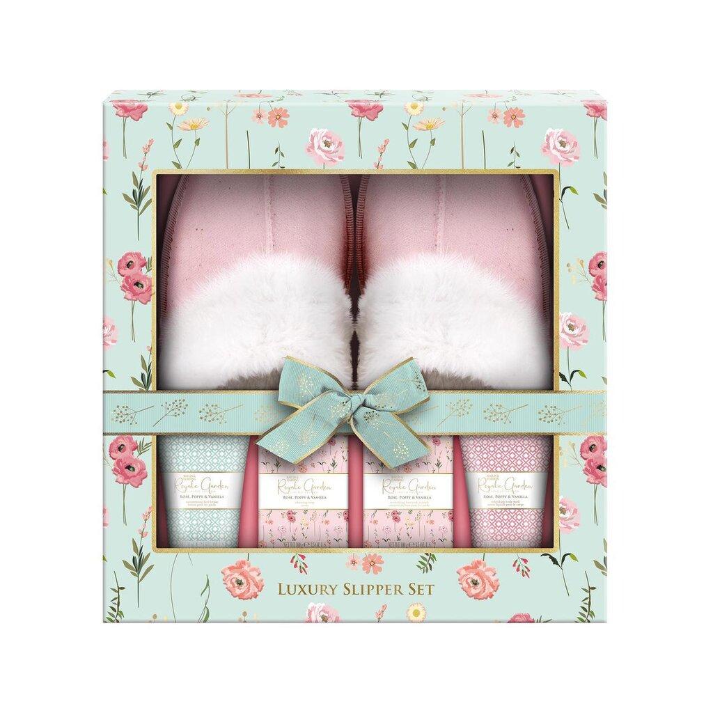Luxury foot care set for gentle skin cleansing, includes foot lotion 50 ml, foot soak crystals 100 g, soap 100 g, body wash 50 ml, slipper fur.