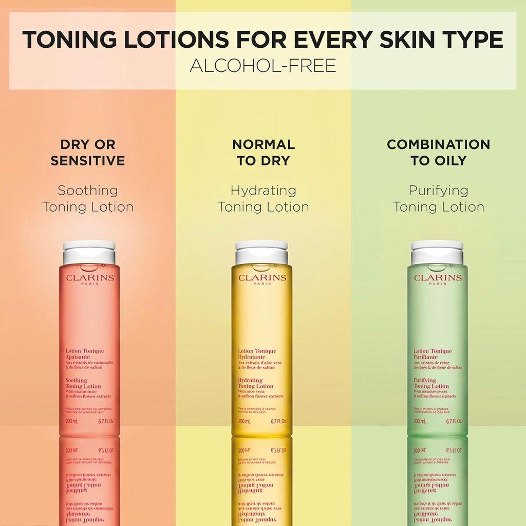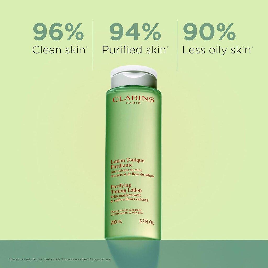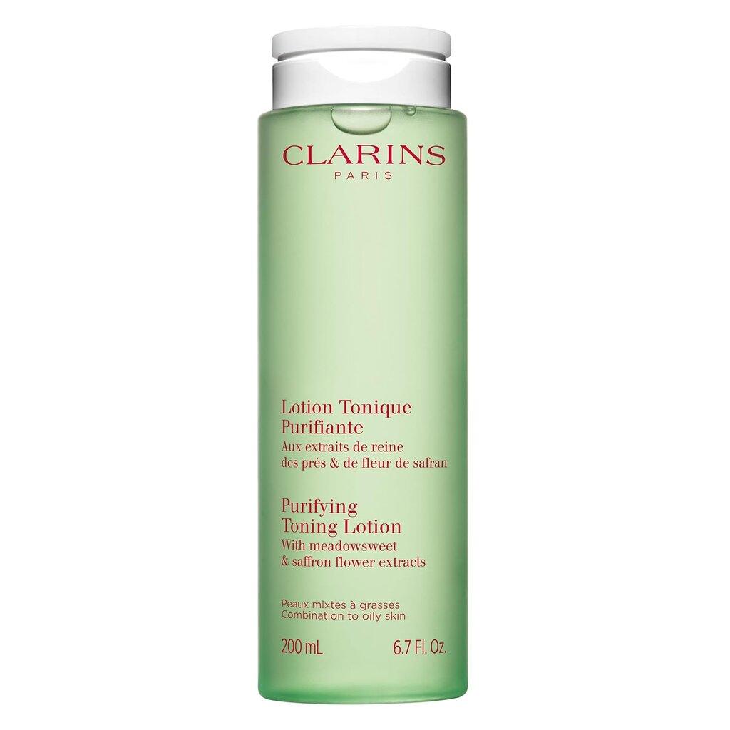 Clarins Purifying Toning Lotion is a 200ml toner that cleanses, hydrates, purifies, mattifies, and balances the skin's microbiota. It contains witch hazel and is suitable for combination to oily skin types. Experience less oily skin after just 14 days of use.