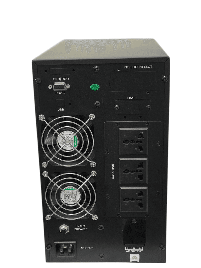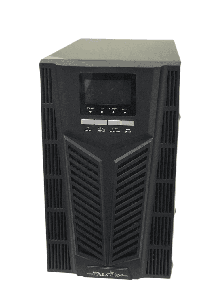 LCD Panel: Load level, Battery level, AC Mode, Battery Mode, Bypass Mode, and Fault Indicators