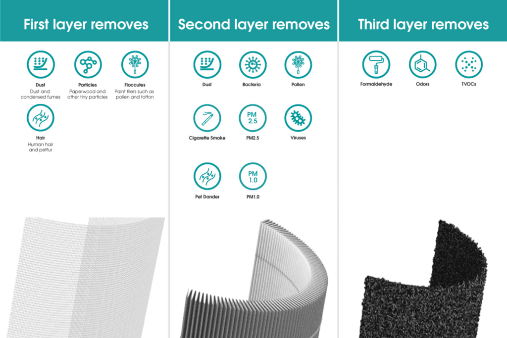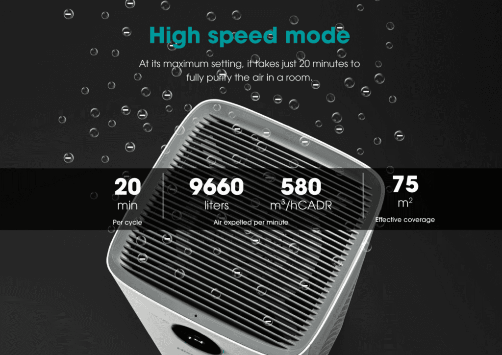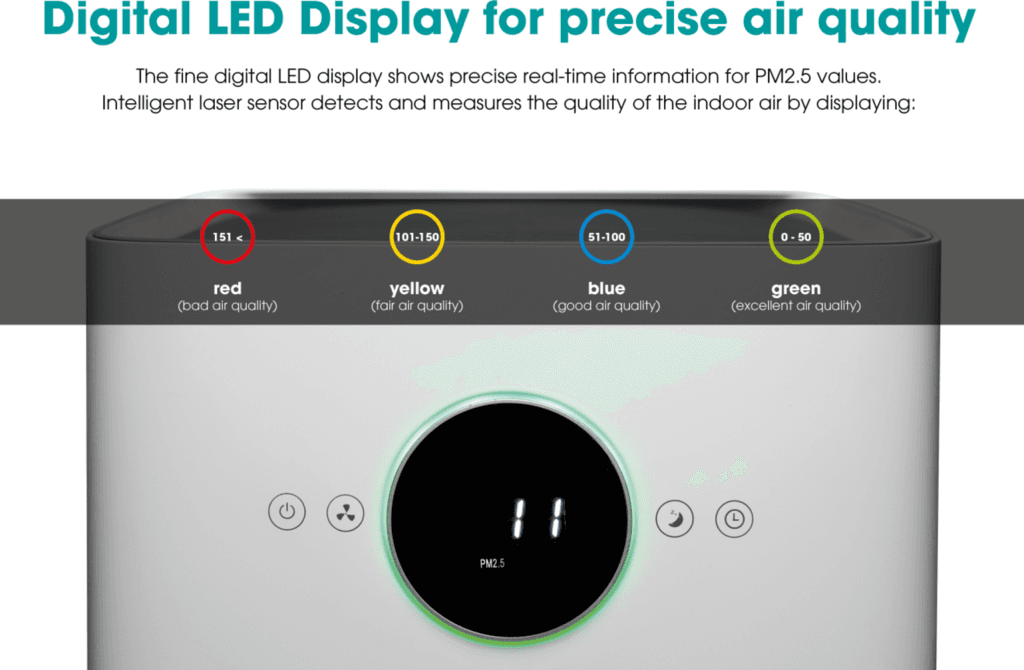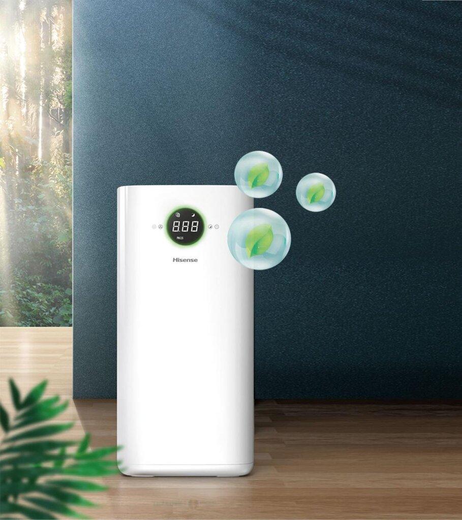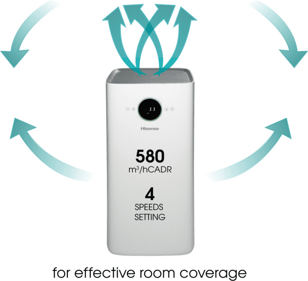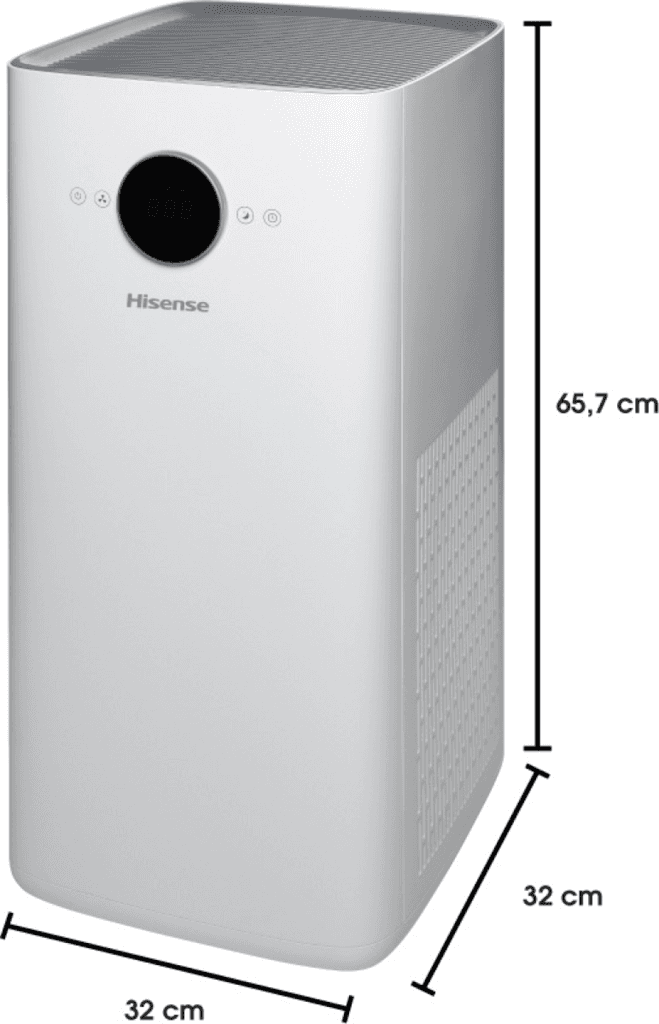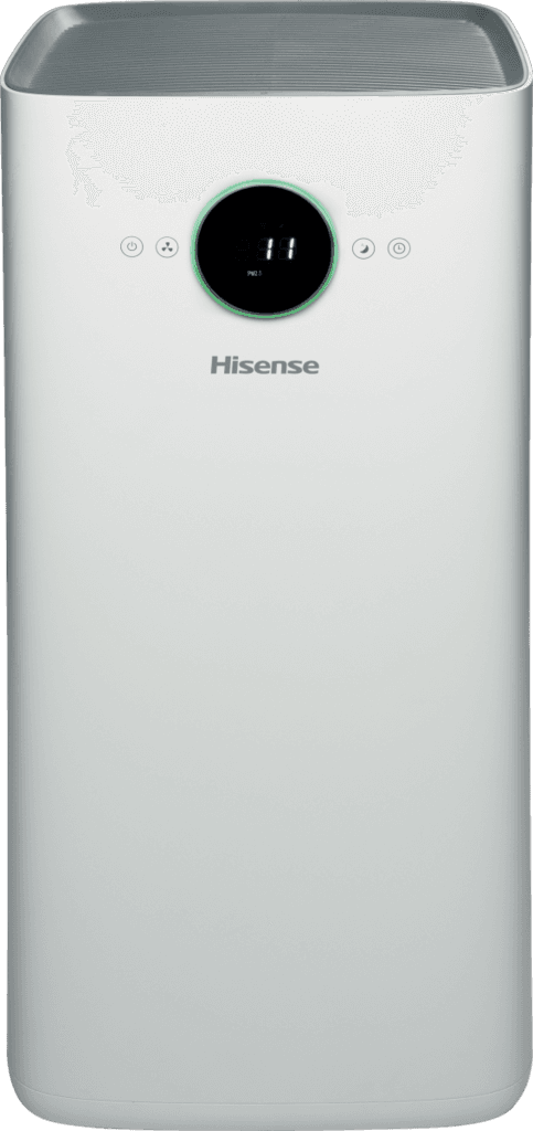 The Hisense AP580H air purifier improves indoor air quality with its multi-layer filtration system, capturing dust, pollen, smoke, and other airborne particles. It features Wi-Fi connectivity for smart control via a smartphone app, an air quality indicator, and quiet operation, making it suitable for medium to large rooms.