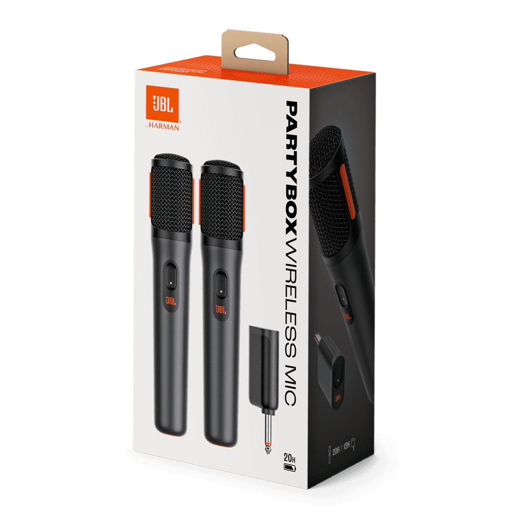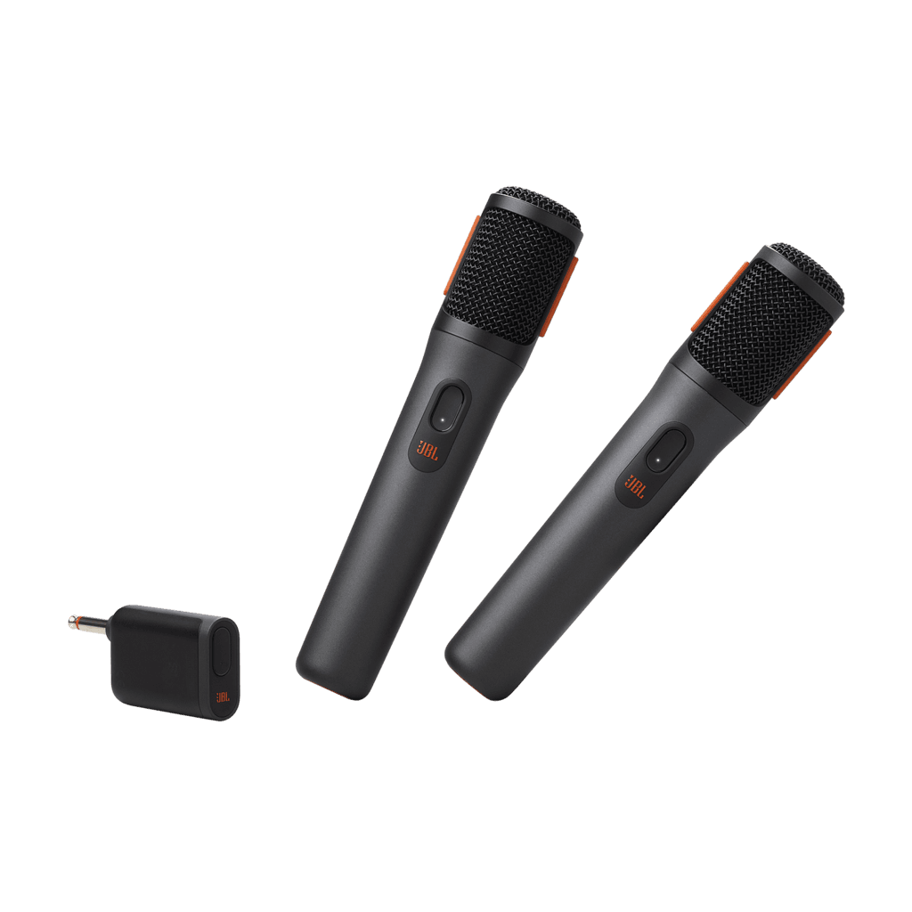 Amplify the moment with the JBL Wireless Microphones. These microphones deliver JBL Original Pro Sound vocal clarity and incredible detail. Simply plug the dual channel wireless receiver into your speaker, power on the mics, and you’re ready to go. Easy setup, no fuss. AA batteries will keep you singing up to 6 hours.